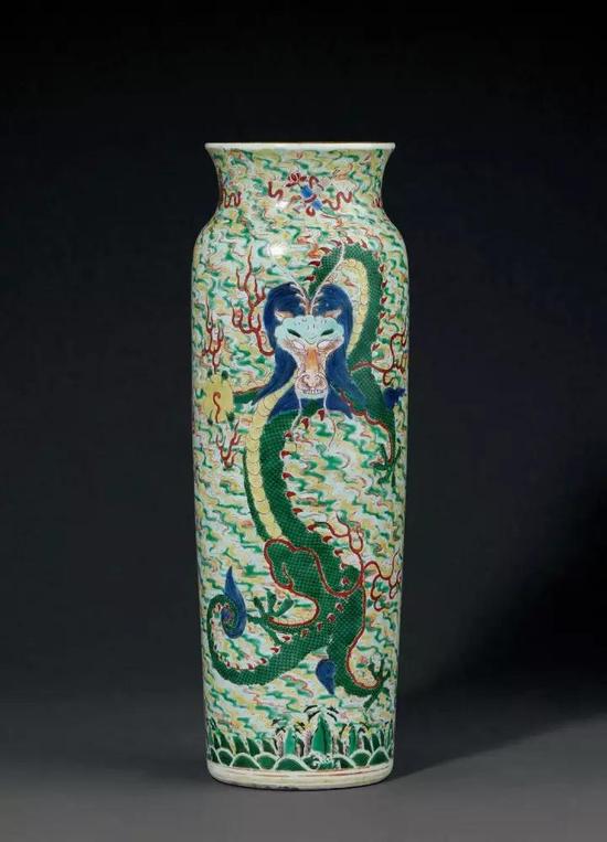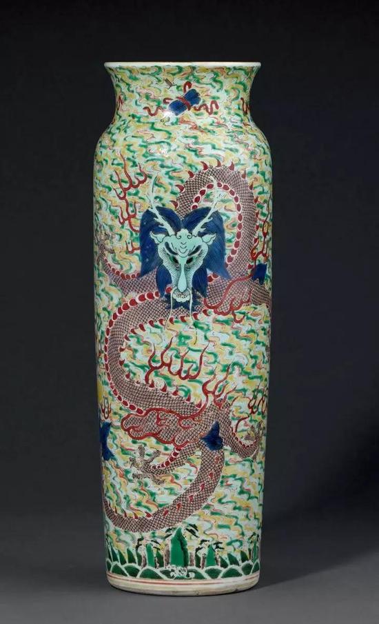 瓷器绘正面龙者,最早见于明代嘉靖时期,因龙首居中,左右对称,似正襟居坐,又称为“坐龙”。 筒瓶尺寸甚大,外壁通体以五彩绘祥云满布,云中腾跃紫、绿两条五爪龙,其双角上翘似鹿,面长似马,鬃毛披散于龙首两侧,形象威猛。 拍品纹饰形象特征鲜明,与之相类者,可见中国国家博物馆藏明崇祯五彩云龙纹盘,底落“甲戌春孟赵府造用”,为崇祯七年(1634)赵王府订烧之器,法国吉美博物馆另藏一件同式的五彩云龙纹盘,拍品或属相同渊源,为存世少见的崇祯五彩大器,极为难得。